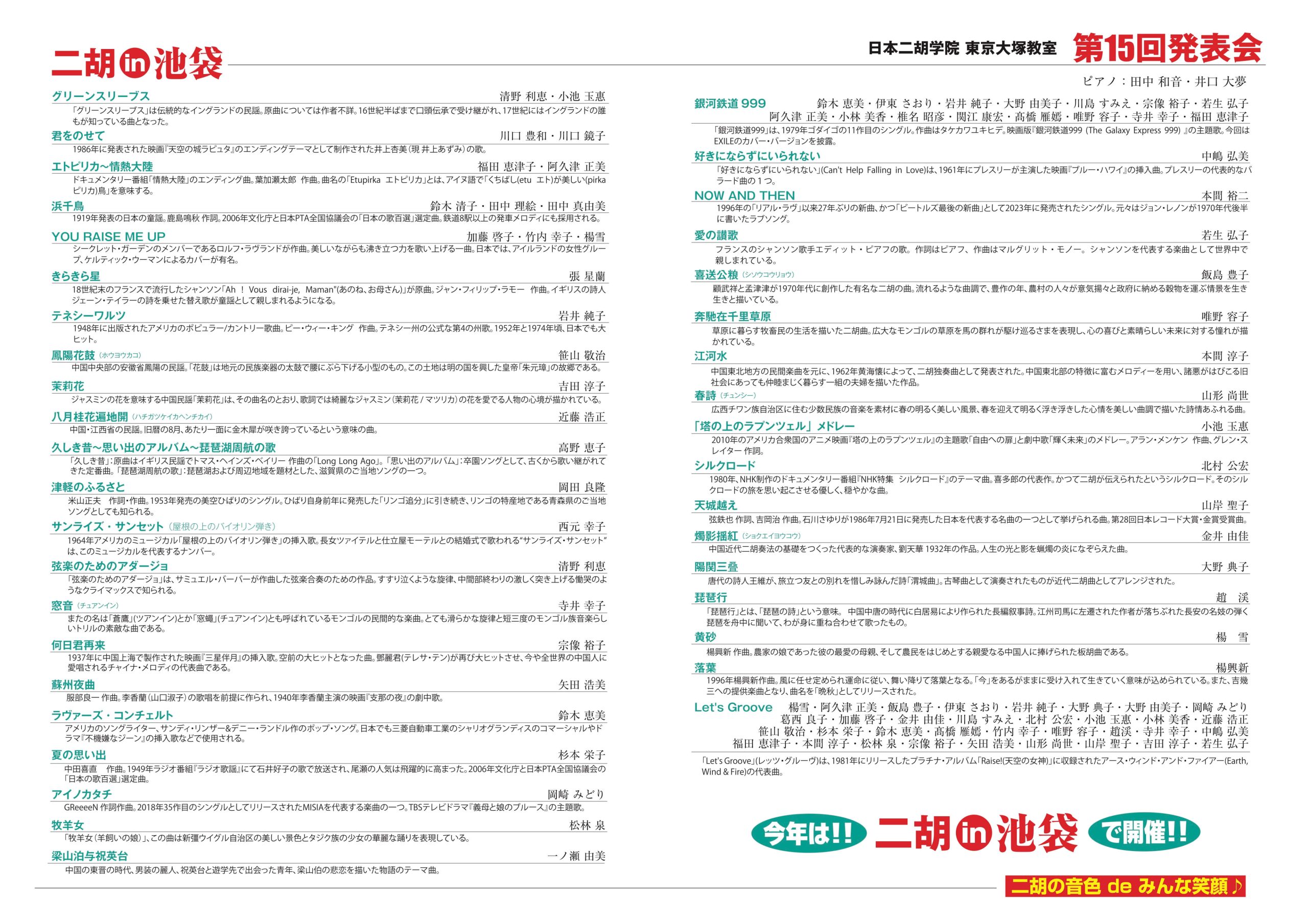 ◇ 8月15日(木) 日本二胡学院 東京大塚教室 第15回発表会のプログラムを追加しました。
